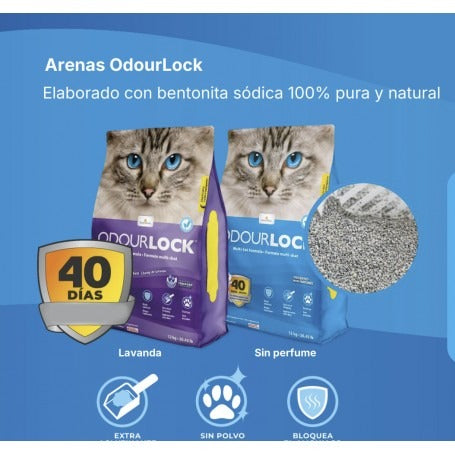 La OdourLock Arena Sanitaria para Gatos es una opción premium, perfecta para los hogares. Gracias a su tecnología avanzada, esta arena neutraliza de forma eficaz los olores provenientes de la orina y las heces durante más de 40 días, lo que garantiza un ambiente fresco y sin malos olores. La clave de su efectividad está en su capacidad para bloquear el amoniaco, que se forma cuando la orina entra en contacto con el oxígeno, evitando la proliferación de bacterias que causan malos olores.