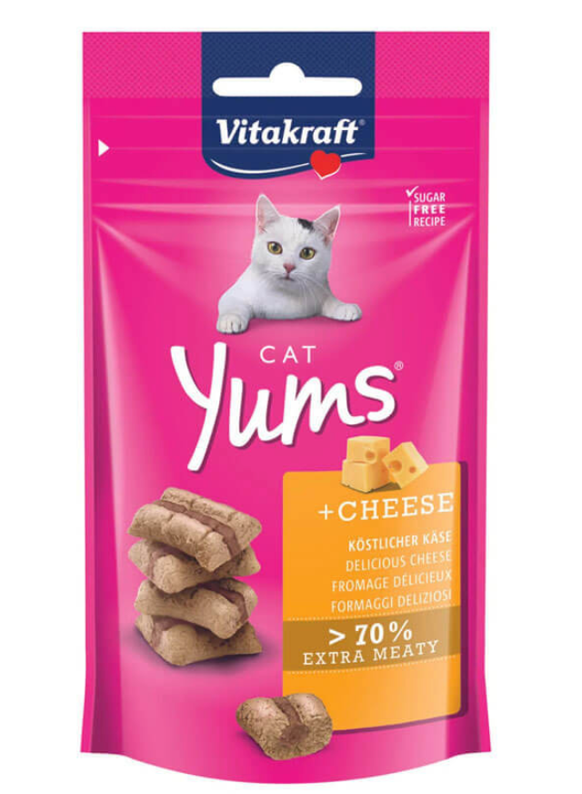 Vitakraft Yums con Queso son golosinas 70% carne con una consistencia especialmente sabrosa. Se elaboran en un proceso único, con los mejores ingredientes en una formulación sin azúcar. El proceso de horneado asegura que el relleno se mantenga suave con una experiencia de masticación jugosa.