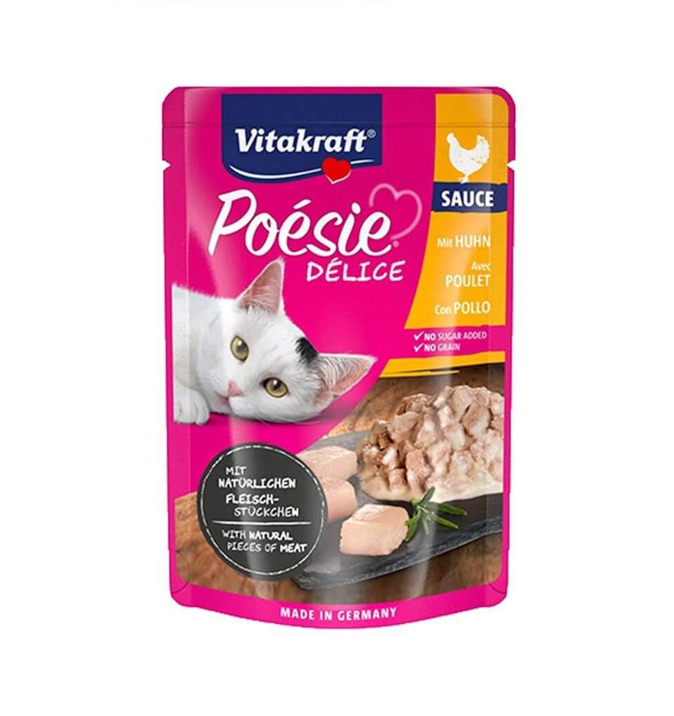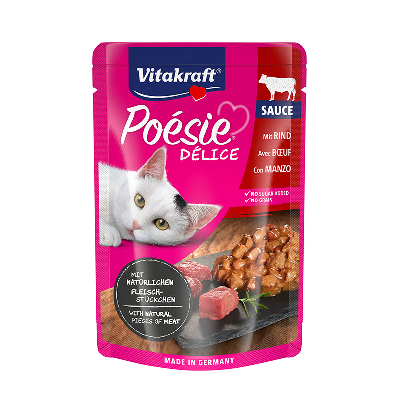Vitakraft Cat Poésie Delice es un alimento húmedo para gatos envasado en una bolsita de calidad premium. Su alta calidad, su deliciosa salsa y su fácil reconocimiento de ingredientes, lo hacen muy apetitoso. Con ingredientes adaptados a las necesidades nutricionales de su gato, sin azúcar ni conservantes, ni colorantes.