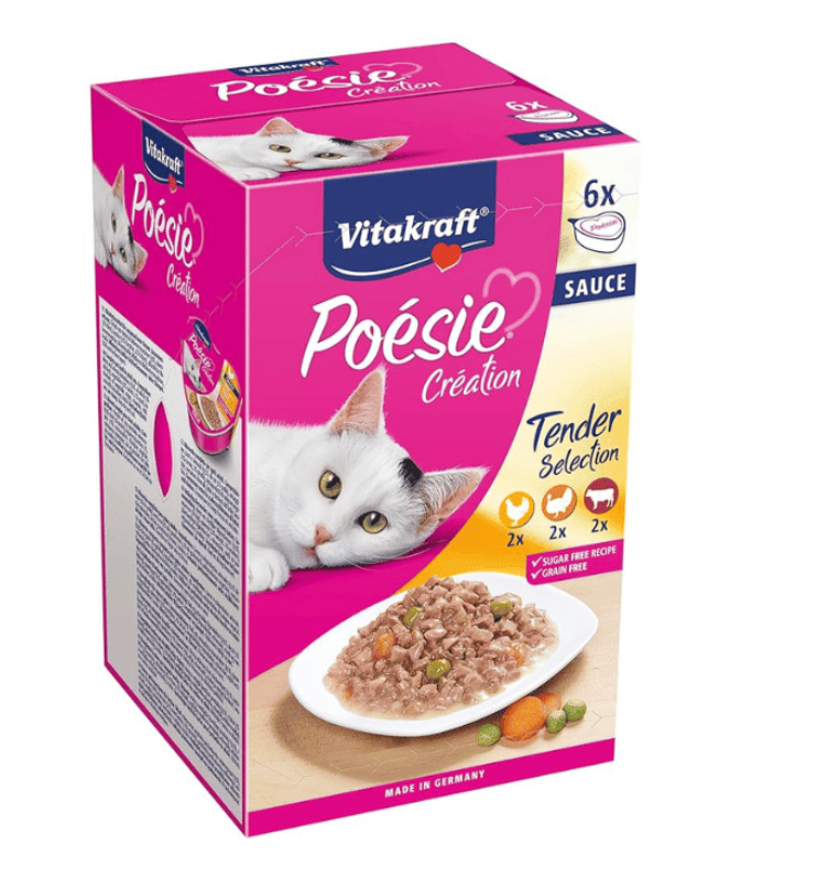 Vitakraft Poésie Creation Multipack es la combinación perfecta entre nutrición y placer para tu gato. Cada porción está cuidadosamente preparada con trozos de carne natural de alta calidad, como tierno filete de pollo, acompañados de sabrosas verduras y una abundante salsa que despierta todos los sentidos.