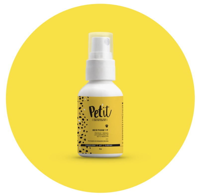 Pet’it Restore’it es un fluido W/O con 30 gramos contenidos en un exclusivo envase sprayable que focaliza la dispersión del producto, otorga la dosis justa a las almohadillas de tu mascota y evita la contaminación del producto.