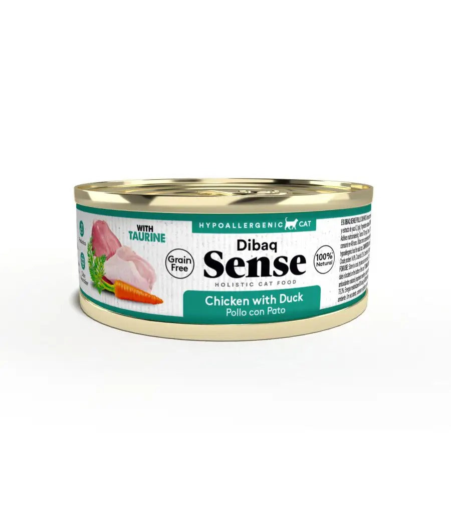 Alimento complementario para gatos adultos, hipoalergénico, libres de grano y gluten. Composición: Pollo 56%, pato 4%, zanahoria 2%, aceite de salmón, prebióticos 0,2g/kg y extracto de yuca 65mg/kg.