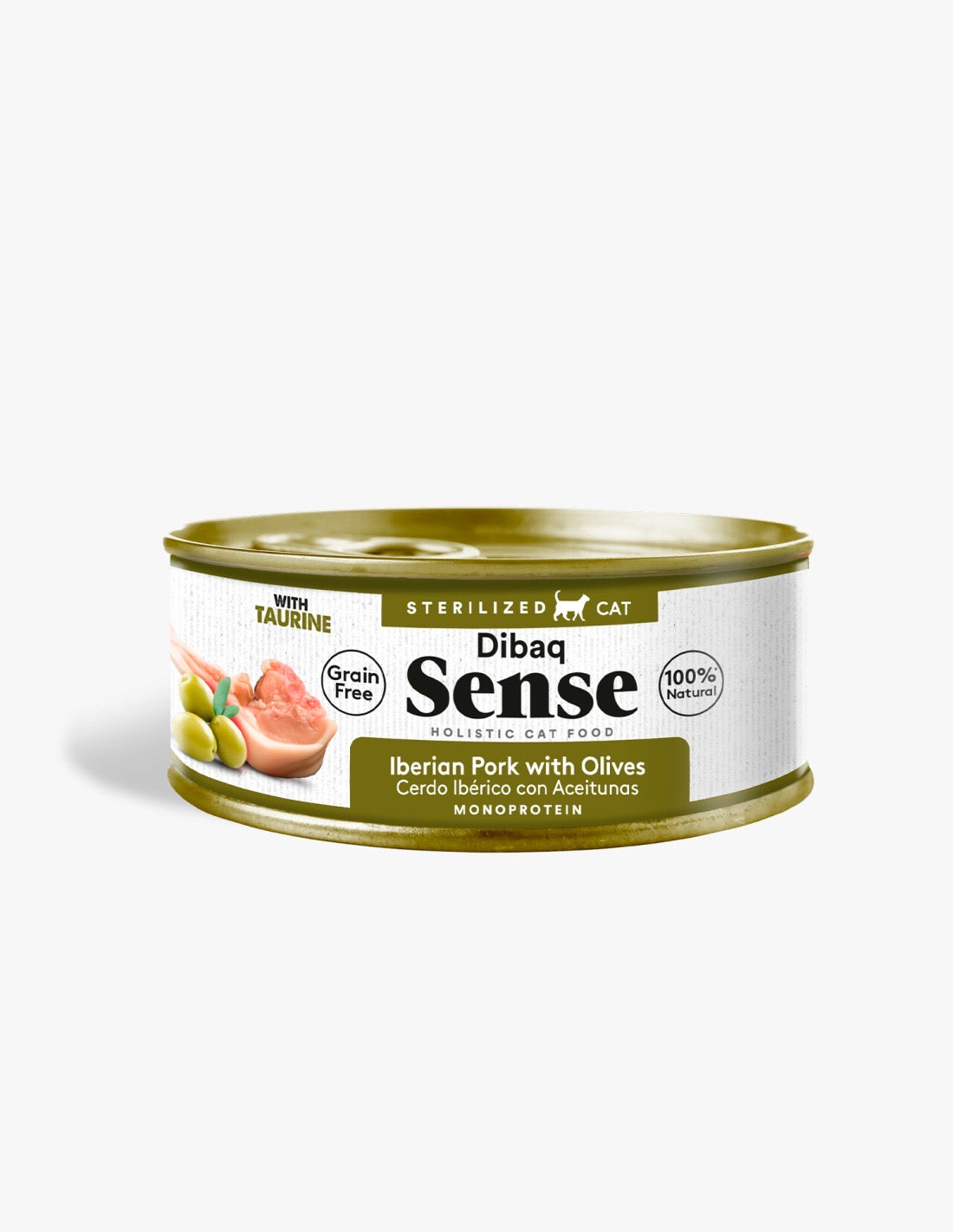 Dibaq Sense Cat Latita de Cerdo Ibérico y aceitunas para gatos adultos y esterilizados es una deliciosa receta grain free elaborada con carnes frescas de cerdo ibérico, aceitunas y taurina, un aminoácido esencial para el correcto funcionamiento de los gatos.