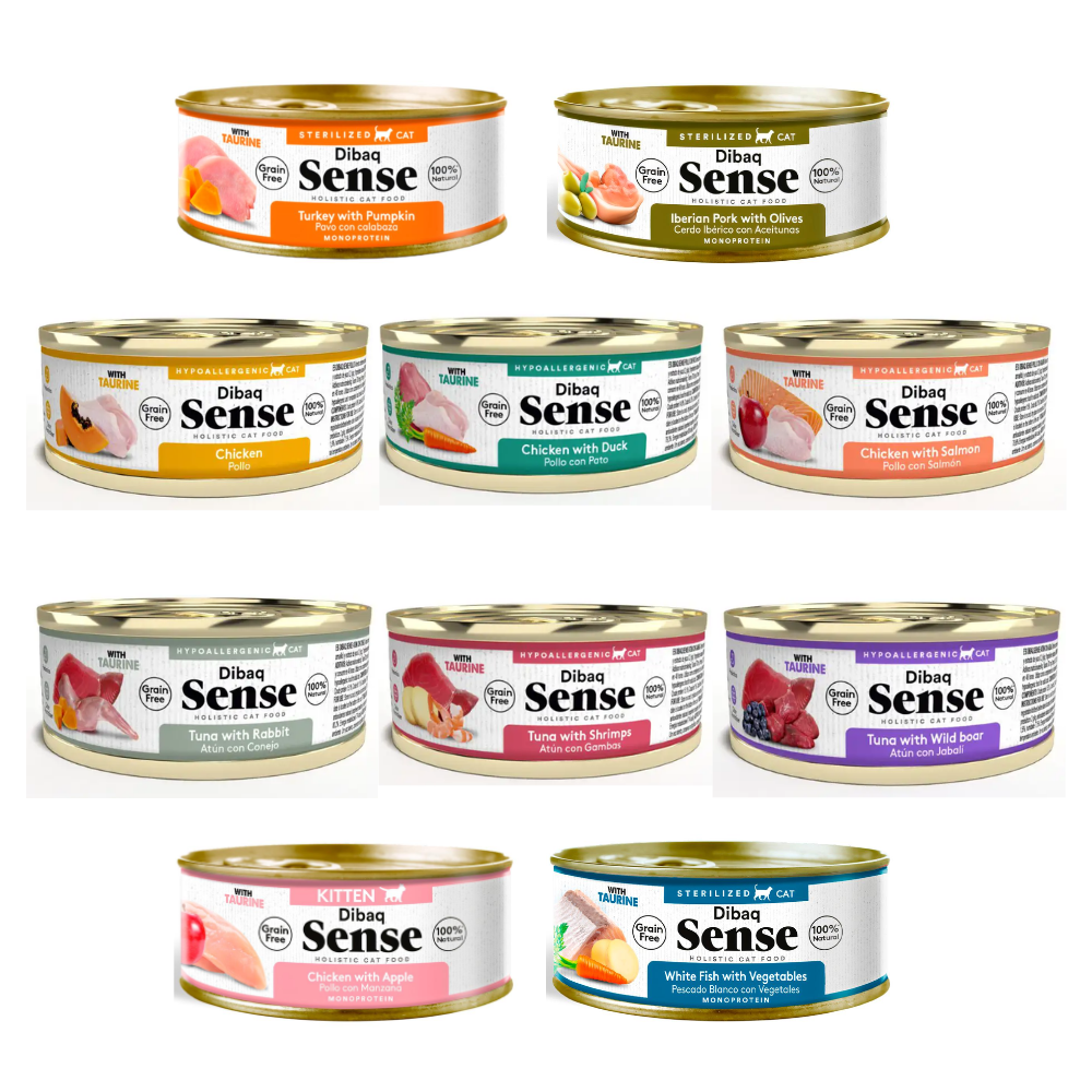 Atún y jabalí: Composición: Atún 50%, jabalí 4%, arándanos 4%, aceite de salmón, prebióticos 0,2 g/kg y extracto de yuca 65mg/kg. Componentes Analíticos: Proteína bruta 15,2%, Grasa bruta 2,2%, Fibra bruta 0,4%, Materia inorgánica 1,5%, Humedad 77,8%. Omega 3 0,27 %, Omega 6 0,42 %. Energía metabolizable 775 kcal/kg. Aditivos: Aditivos nutricionales/kg: Taurina700 mg.